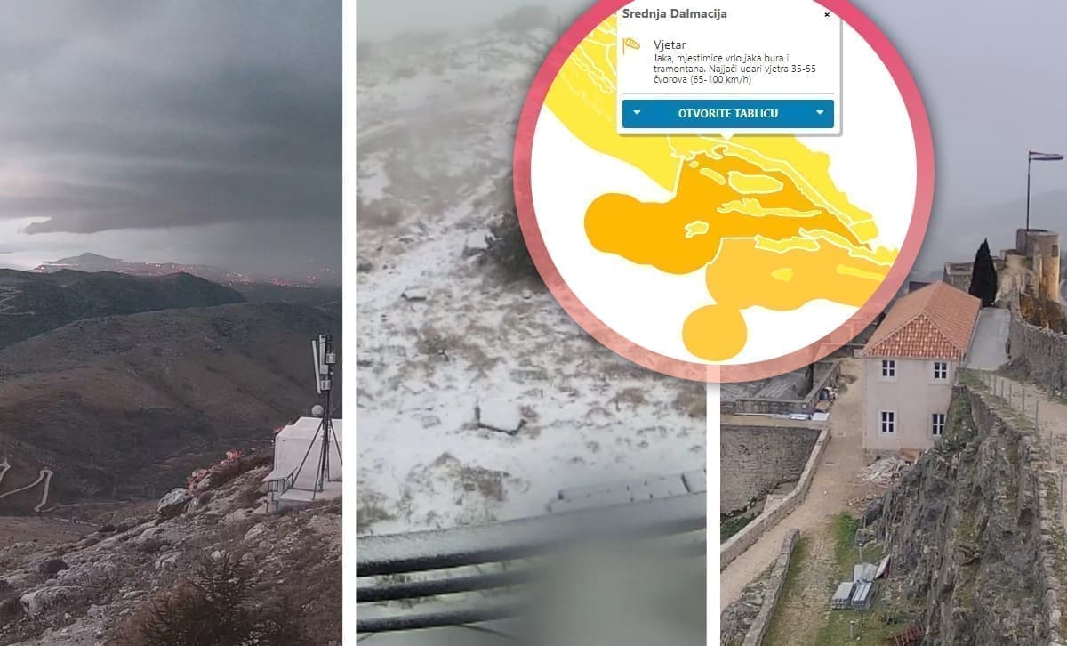 Tijekom večeri snježne oborine zahvatit će velik dio Like i Gorskog kotara, a noćas će susnježice biti u dijelu Dalmatinske zagore. Na sjevernom Jadranu jača bura koja će se noćas proširiti na cijeli Jadran kada će biti jaka do olujna. Bit će to uvod u stabilan, ali vjetrovit utorak kada se podno Velebita i Biokova očekuju i orkanski udari bure. Bit će malo hladnije u odnosu na ponedjeljak.