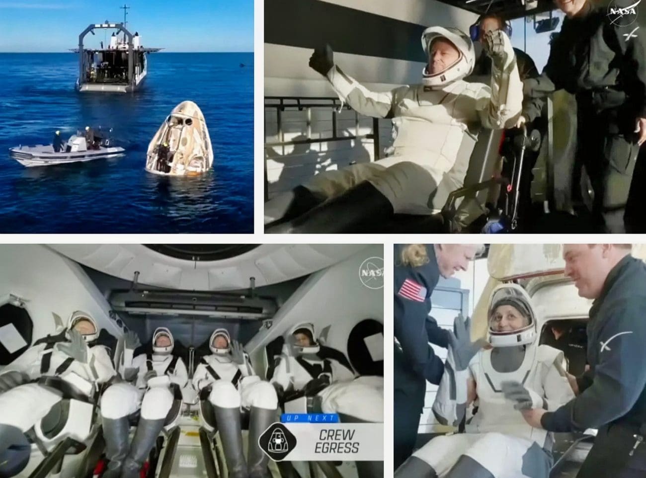 Prvi je iz kapsule izašao zapovjednik Nick Hague, a potom i ostatak četveročlane posade. Suni Williams i Butch Wilmore, koje je javnost prozvala „Butch i Suni“, pojavili su se među posljednjima, uz široke osmijehe i mahanje kamerama. S obzirom na dužinu boravka u bestežinskom stanju, nužna je pomoć pri izlasku jer tijelu treba vremena da se privikne na Zemljinu gravitaciju. Ipak, raspoloženje im je bilo izvrsno, što se vidjelo iz simpatičnog pozdrava Butcha koji je dižući palac u zrak dao do znanja da je sve u najboljem redu.