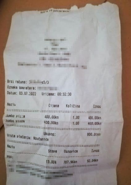 Dalmacija Danas je u posjedu računa iz pekarnice na Hvaru u kojoj su dvije jumbo pizze naplaćene 800 kuna. Da, dobro čitate.