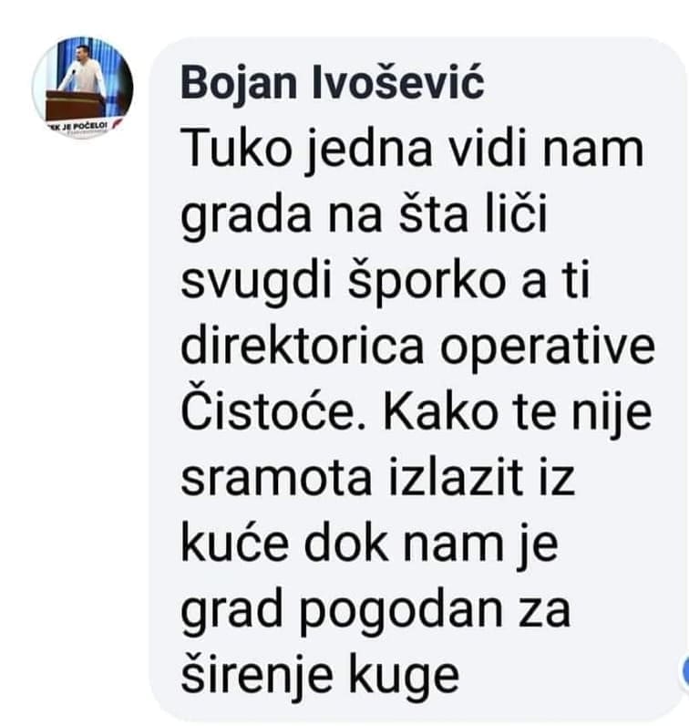 "Citiram našeg zamjenika: Tuko jedna, vidi na šta nam grad liči. Svugdi šporko a ti direktorica operative. Kako te nije sram izlaziti iz kuće dok nam je grad pogodan za širenje kuge", čitanjem sadržaja tog komentara, Igor Stanišić je završio svoje izlaganje.