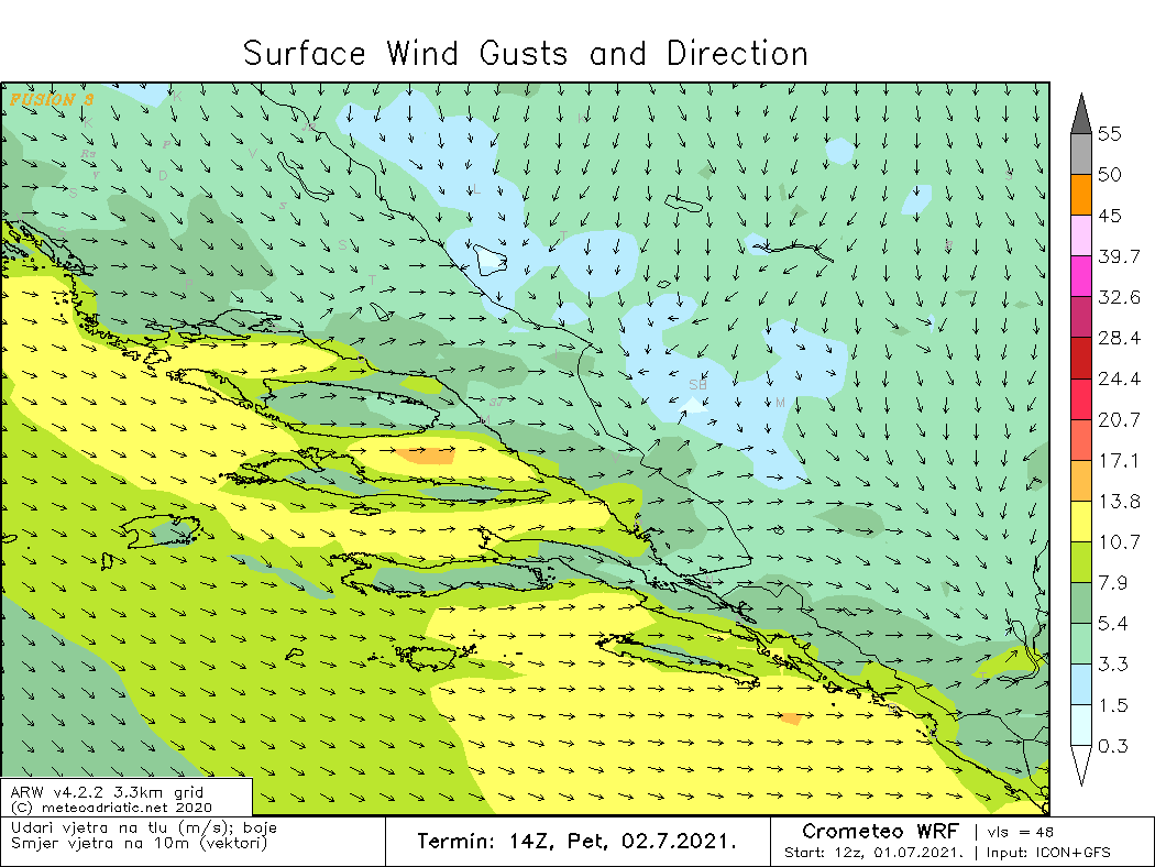Tijekom petka očekuje nas djelomično sunčano, suho, ali i prilično vjetrovito vrijeme. Ujutro i navečer puhat će slaba do umjerena bura, danju umjeren zapadnjak i sjeverozapadnjak koji će popodne biti pojačan, a u kanalima među otocima prolazno može imati i vrlo jake udare. Minimalne jutarnje temperature zraka od 15 do 25°C, a najviše dnevne od 28 do 34°C.