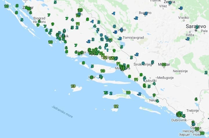 U većem dijelu Dalmacije subotnje jutro osvanulo je uz pretežno ili potpuno vedro vrijeme, s minimalnim temperaturama od -2 do 10 u Zagori, te 5 do 13 stupnjeva na obali i otocima. Bilo je uglavnom tiho ili uz slab burin i sjeverozapadnjak.
