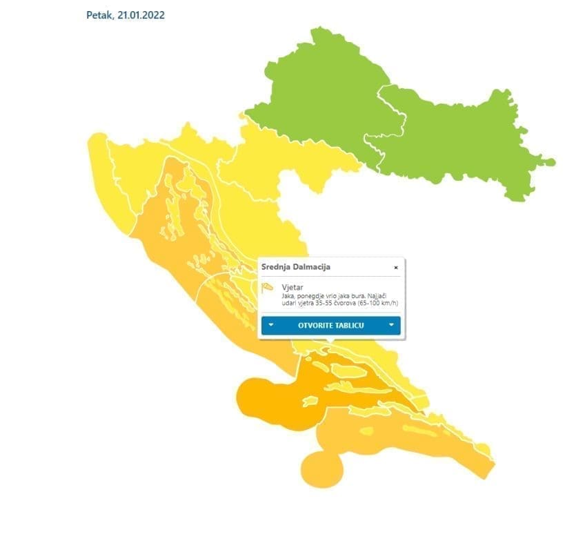 Danas nas očekuje promjenjivo oblačno i suho. Puhat će umjerena do jaka bura, podno obalnih planina bit će olujnih udara. DHMZ unutar sustava MeteoAlarm za danas daje narančasti stupanj upozorenja zbog bure koja će imati udare do 100 km/h. Minimalne jutarnje temperature zraka u Zagori od 0 do 4°C, uz obalu i na otocima od 4 do 8°C. Najviše dnevne temperature od 3 do 12°C.