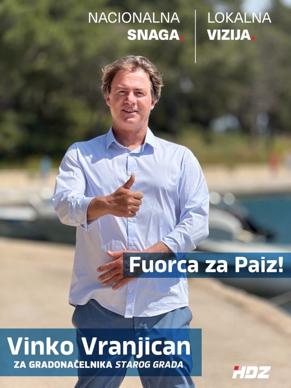 Vinko Vranjican, kandidat HDZ-a za gradonačelnika Staroga Grada, predstavio je izborni program pod sloganom „Nova fuorca za Paiz!“. U obraćanju javnosti, Vranjican je istaknuo kako Stari Grad treba novu snagu koja će riješiti ključne probleme s kojima se Stari Grad suočava. Na prvom mjestu je demografska revitalizacija i podrška mladima koja uključuje subvencije za stanovanje, povećane potpore za novorođenčad, besplatan vrtić za drugo i svako sljedeće dijete, te veće stipendije za učenike i studente. Nadalje, tu je poticanje zapošljavanja i poduzetništva s naglaskom na mlade poduzetnike i razvoj cjelogodišnjih djelatnosti, a ne samo tijekom sezone. S obzirom na to da se stanovnici Starog Grada, kao i većina otočana, suočavaju s problemom nedostatnih zdravstvenih usluga; Vranjican predlaže jaču suradnju s nadležnim županijskim ustanovama, a što će uključivati redovite specijalističke preglede na otoku i mobilne liječničke timove. Uz to, u programu „Nova fuorca za Paiz!“ predviđena su brojna ulaganja u infrastrukturu i javne prostore. Naglasak je na asfaltiranju i uređenju cesta (Rudina, Ager, Kabal, Dol), proširenju parkirnih kapaciteta, uređenje rive i trajektne luke, te sustavno čišćenje plaža i tržnice, te uređenje lovačkog i vatrogasnog doma.