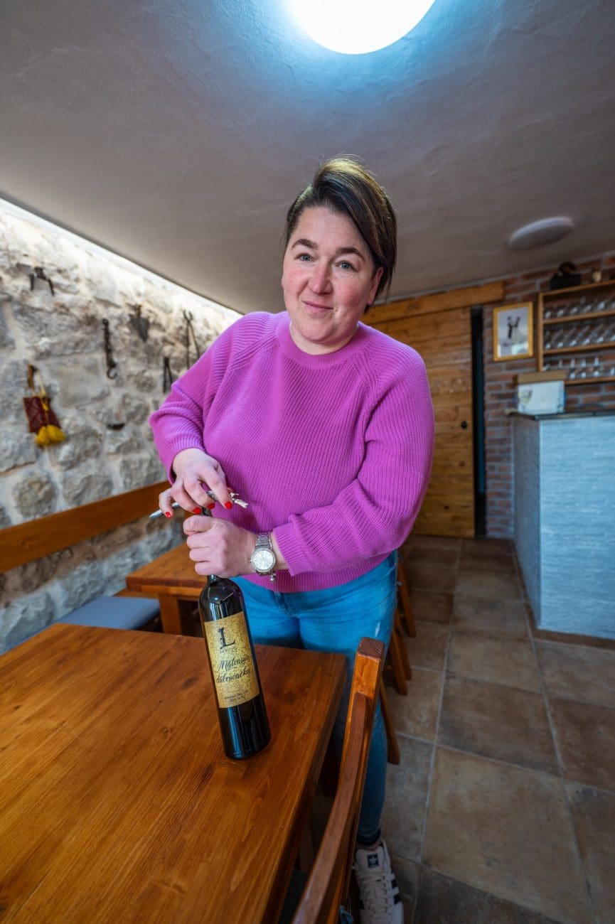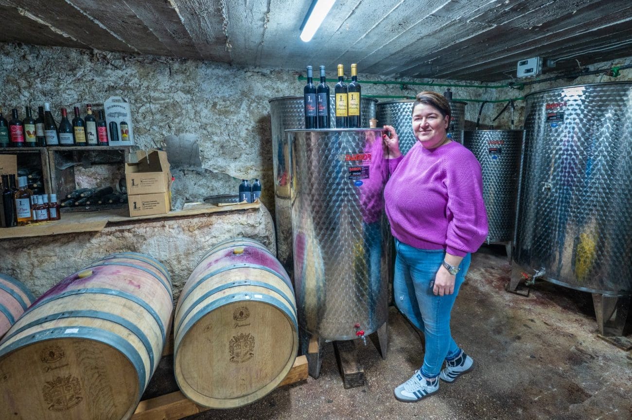 “Uz dubrovačku malvasiju radimo cuvée Sveti Mihovil od merlota, caberneta i vranac‑a, njegovu dvogodišnju ‘rezerve’ verziju iz barriquea te rosé od cabernet sauvignona. Sutra stiže prvih tisuću sadnica chardonnaya, a iduće godine sadimo još dvije tisuće malvasije,” nabraja Paula dok pokazuje redove koji strmo padaju prema polju. Malvasija je, dodaje, “najkompliciranija za rezanje – sto prutova u sto smjerova – ali kad godina nije ‘maćkana’, daje vrhunski rezultat”.