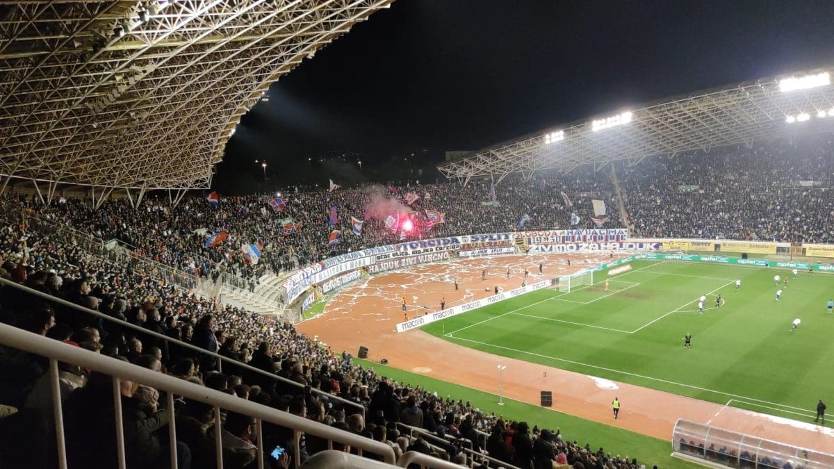 Veličanstvena je atmosfera na Poljudu, žestoko se navija na derbiju Hajduka i Osijeka u sklopu 1. HNL. Na travnjaku je vrlo napeto i neizvjesno i vodi se velika borba.
