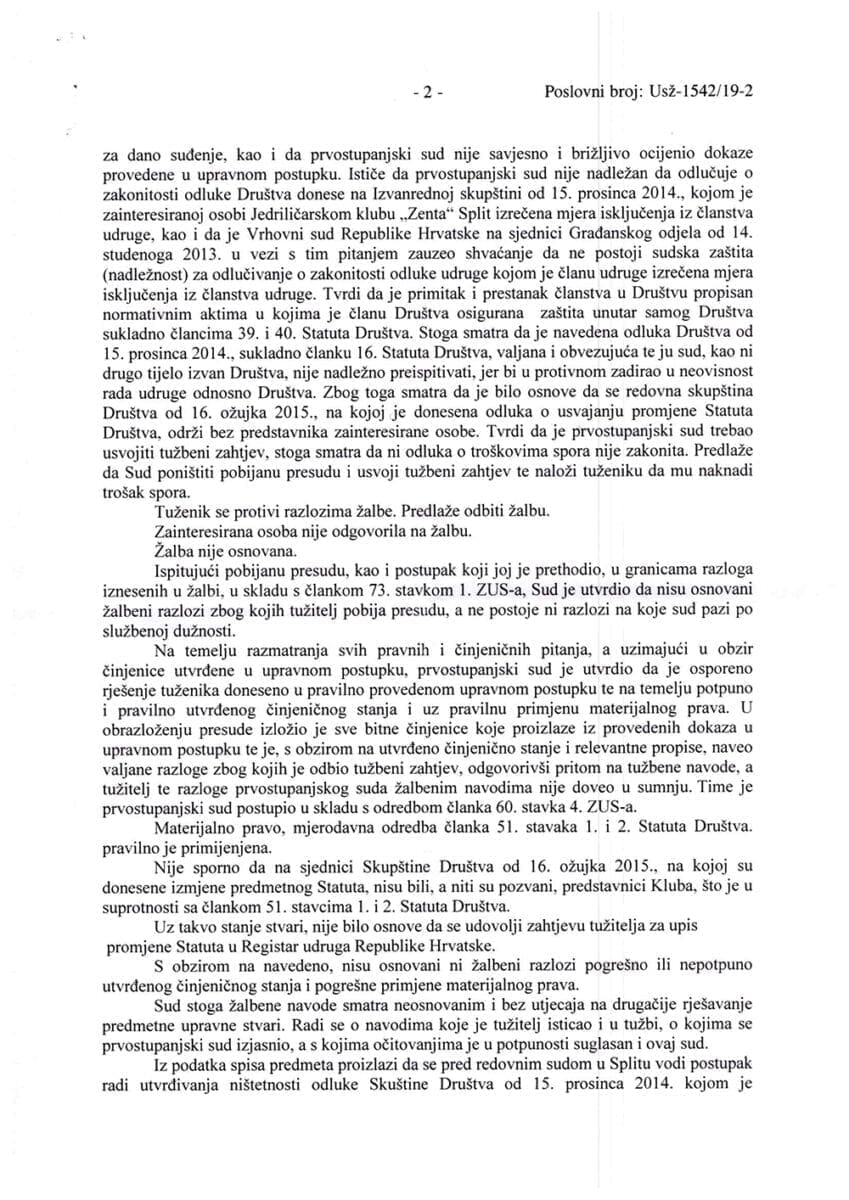 Na Visokom upravnom sudu u Zagrebu odbijena je žalba Pomorsko športskog društva (PŠD) Zenta i potvrđena presuda Upravnog suda u Splitu, kojom se odbija ispis, odnosno isključenje, Jedriličarskog kluba (JK) Zenta iz Društva.