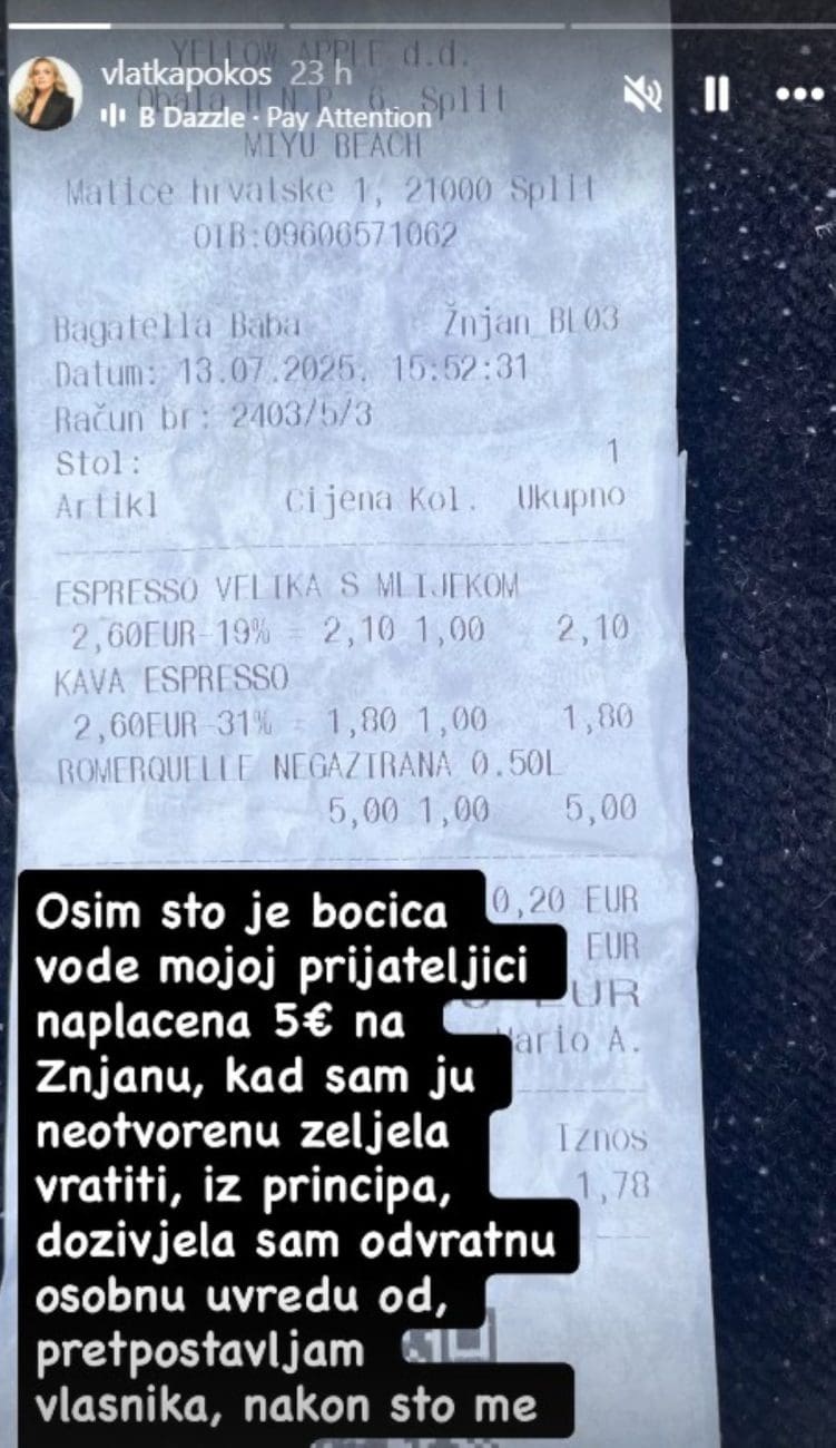 "Osim što je mojoj prijateljici bočica vode naplaćena čak pet eura, kada sam ju, iz principa, pokušala vratiti jer nije bila otvorena, doživjela sam užasnu osobnu uvredu od, pretpostavljam, vlasnika lokala, koji me prepoznao", napisala je Vlatka uz fotografiju računa, odlučivši javno prozvati vlasnika i pri tome upitala svoje pratitelje poznaje li ga netko.