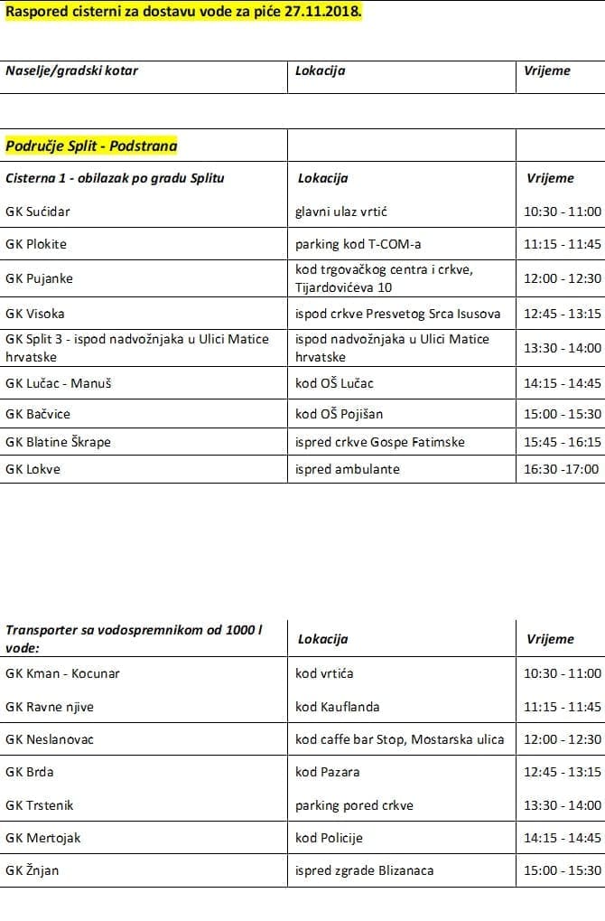 Raspored cisterni za dostavu vode za piće 27.11.2018.