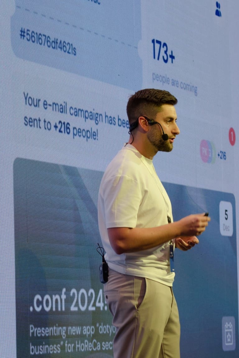 Dragan Petric, izvršni urednik Bug-a, koji je otvorio i zatvorio konferenciju, svojim je govorom povezao priču o tehnologiji, inovacijama i budućnosti ugostiteljstva, naglasivši važnost digitalizacije u industriji koja se brzo mijenja. Također, nakon osvajanja 3. mjesta na natjecanju Idea Knockout 2023. godine, dotyourspot je s Draganom i njegovim timom početkom 2024. godine sudjelovao na svjetskom CES događaju u Las Vegasu, gdje su imali priliku predstaviti svoje proizvode globalnoj publici. Ovim nastupom proširili su prepoznatljivost svojih inovacija i proširili tržište na kojem djeluju. Nakon .conf prezentacije, gosti su imali priliku iz prve ruke isprobati aplikaciju i uvjeriti se u njene mogućnosti na demo štandovima.