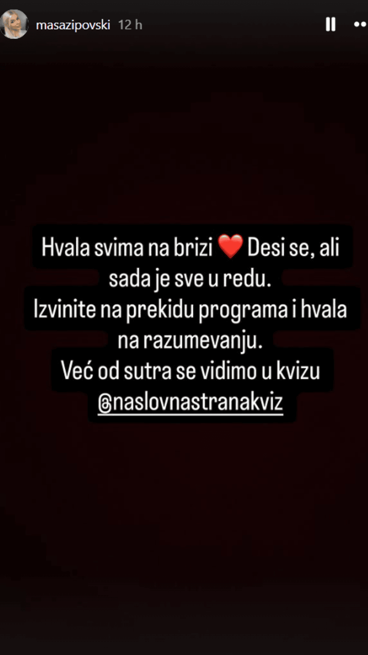 "Hvala svima na brizi. Dogodi se, ali sada je sve u redu. Oprostite na prekidu programa i hvala na razumijevanju. Već od sutra se vidimo", napisala je, piše Dnevnik.hr.