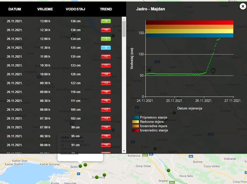 Obilne kiše uvjetovale su brz porast dalmatinskih krških rijeka. Primjerice, Jadro je na mjernoj postaji u Majdanu od jučer poraslo za oko metar, a Žrnovnica kod izvora za oko 70 centimetara. Ove rijeke danas su poplavile najniže dijelove obale.
