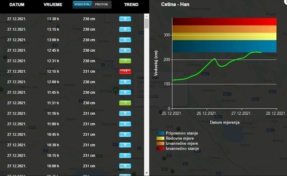 Na području malog sliva Cetina, na mjernoj postaji Han danas u 13:00 izmjeren je vodostaj Cetine od 230 cm te isti stagnira.