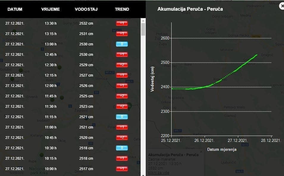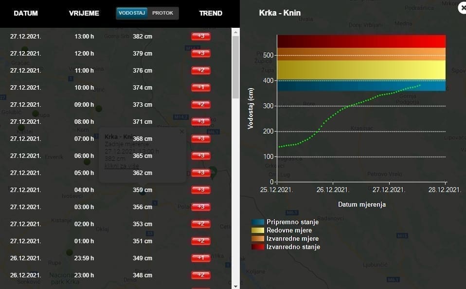 Na području malog sliva Krka – šibensko primorje na mjernoj postaji u Kninu u 13:00 izmjeren je vodostaj Krke od 382 cm te je u tijeku pripremno stanje obrane od poplava.