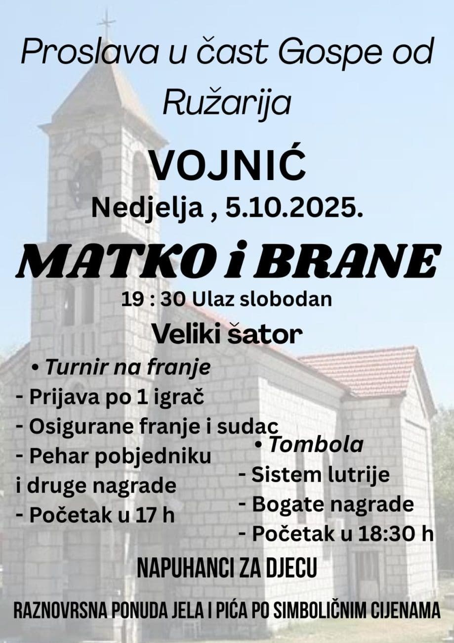 Povodom blagdana Gospe od Ružarija, jednog od najvažnijih slavlja za vjernike i mještane Vojnića, Društvo mladih iz mjesta priprema bogat i raznovrstan program namijenjen svim generacijama. Proslava će kulminirati u nedjelju, 5. listopada, kod crkve u Vojniću, gdje će se održati veliki koncert popularnog glazbenog dvojca Matko i Brane. Početak koncerta najavljen je za 19:30 sati, a očekuje se veliki odaziv posjetitelja iz cijele okolice.