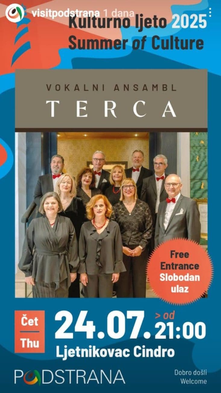 Ljetne večeri u Podstrani i ove godine obogaćene su raznolikim kulturnim programom, a jedno od posebnih glazbenih gostovanja očekuje nas u četvrtak, 24. srpnja. U sklopu manifestacije Kulturno ljeto u Podstrani, koju organiziraju Općina Podstrana i Turistička zajednica Općine Podstrana, s početkom u 21 sat na pozornici Ljetnikovca Cindro nastupit će Vokalni ansambl Terca – skupina glazbenih entuzijasta iz Splita, poznata po svojoj energiji, složnosti i ljubavi prema pjesmi.