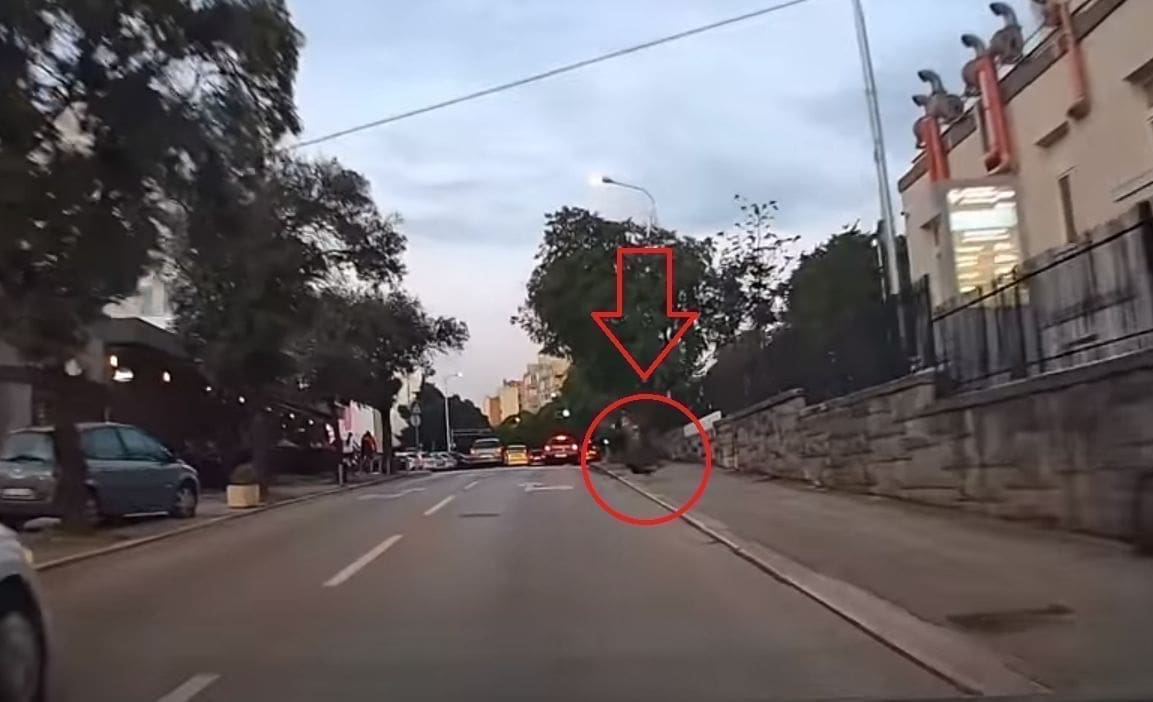 Naime, skočio je sa zida i pokušao pretrčati cestu, ali umalo je završio pod nadolazećim automobilom. Srećom, vozači su bili oprezni te se ovog puta izvukao neokrznut.