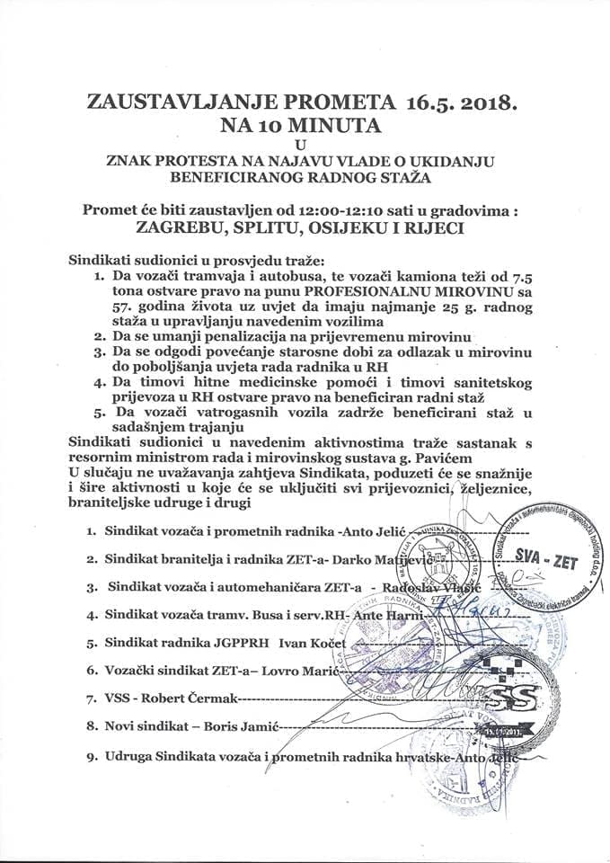 Na sastanku osam sindikata koji djeluju u ZET-u, te u suradnji sa sindikatima prometa iz Osijeka, Splita i Rijeke, dogovoreno je da se u znak protesta zbog najave Vlade o ukidanju beneficiranog radnog staža za određene kategorije radnika, koordinirano zaustavi promet u navedenim gradovima i to u srijedu (16. svibnja) od 12 - 12:10 sati (10 minuta).