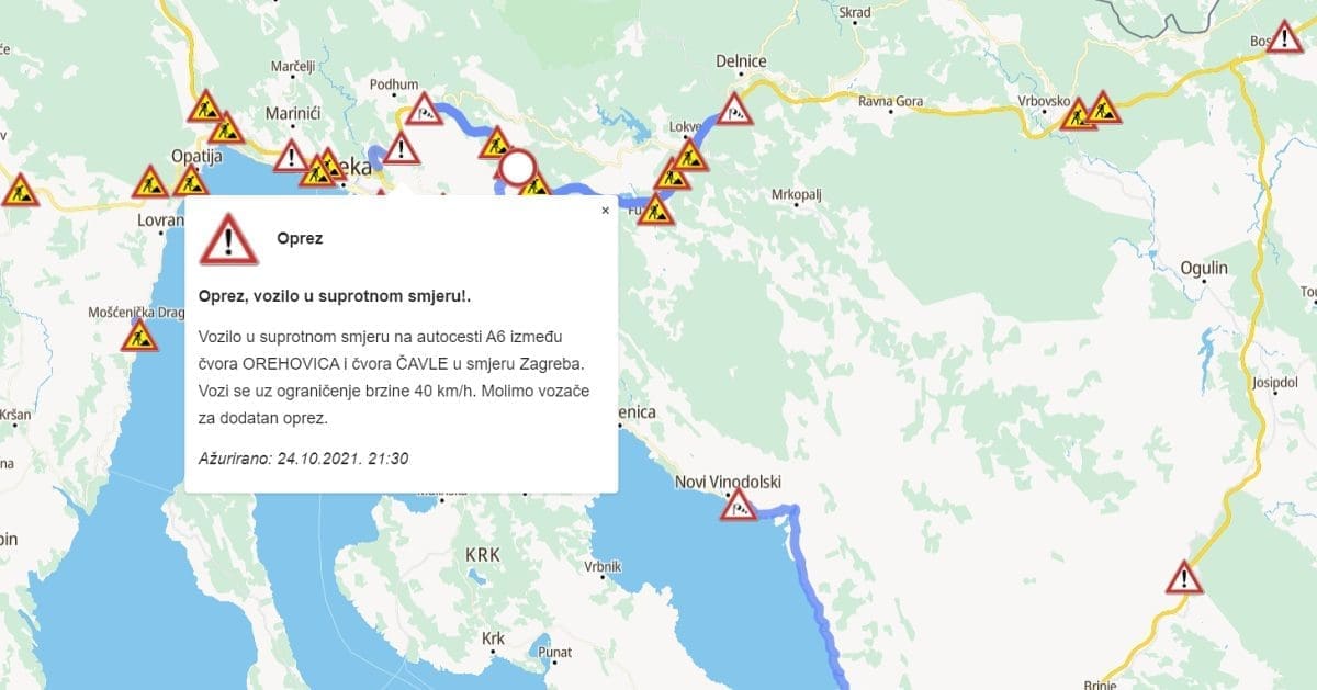 "Vozilo u suprotnom smjeru kreće se na autocesti A6 između čvora Orehovica i Čavle i čvora u smjeru Zagreba. Vozi se uz ograničenje brzine 40 km/h", kratko upozoravaju iz HAK-a te nastavljaju: