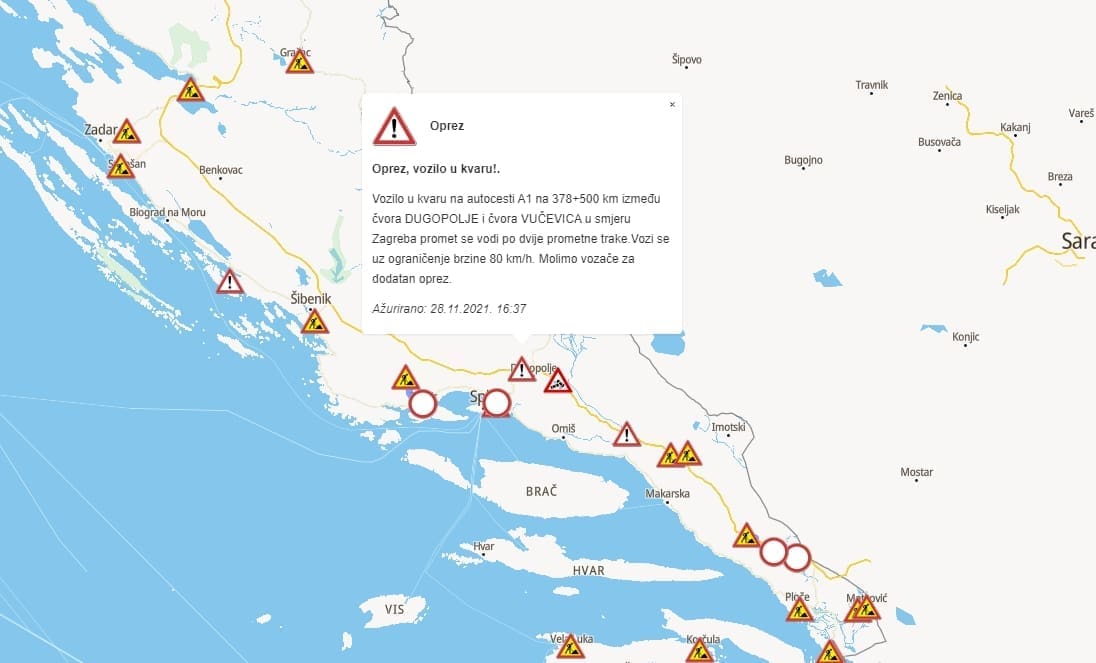 "Vozilo u kvaru na autocesti A1 na 378+500 km između čvora DUGOPOLJE i čvora VUČEVICA u smjeru Zagreba, promet se vodi po dvije prometne trake.