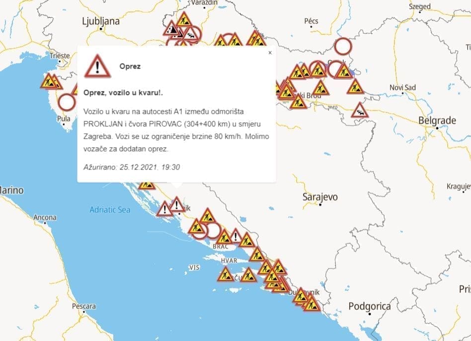 "Vozilo u kvaru na autocesti A1 između odmorišta PROKLJAN i čvora PIROVAC (304+400 km) u smjeru Zagreba.