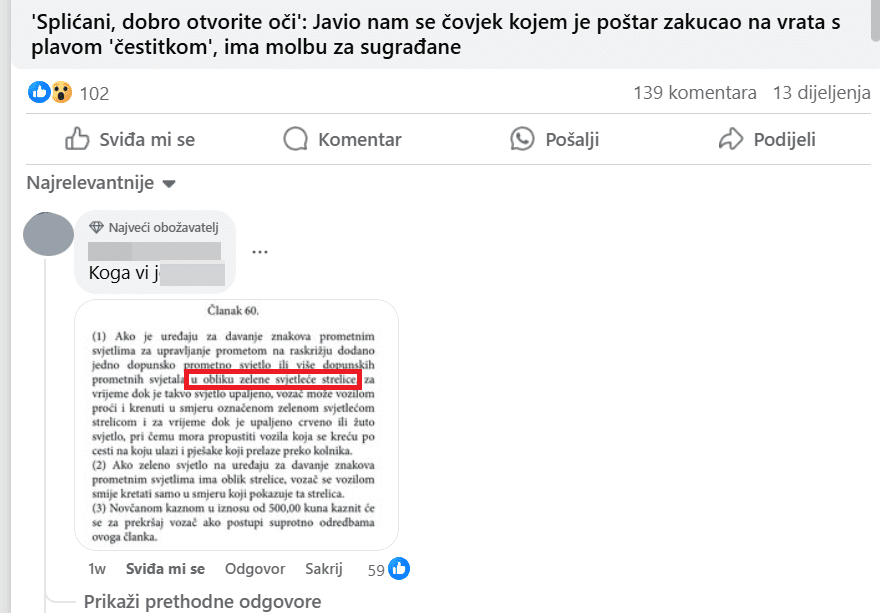 Ipak, iznenađujuće je da je sljedeći komentar lajkalo čak 59 korisnika Facebooka. Autor se pozvao na članak 60. Zakona o sigurnosti prometa na cestama.