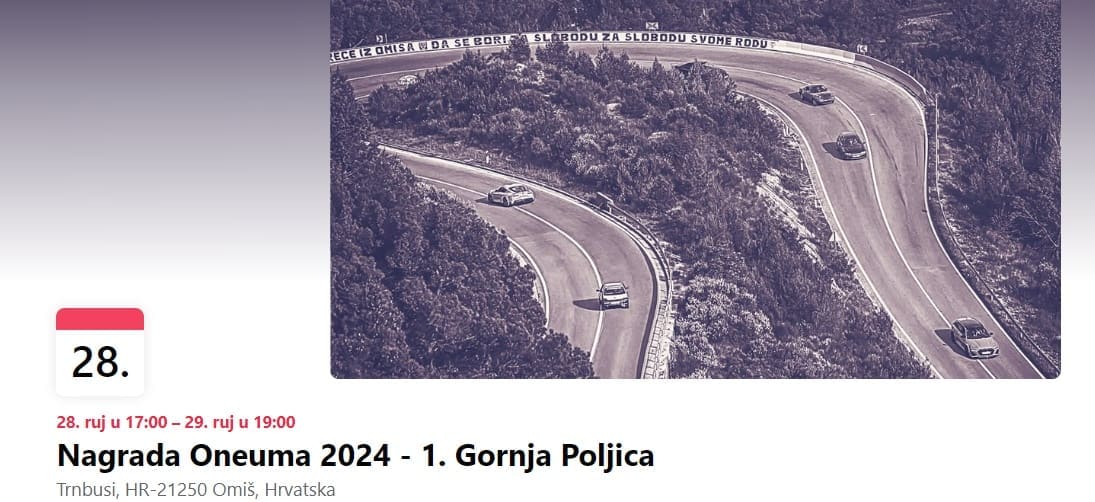Popularno natjecanje "Nagrada Oneuma 2024 - Gornja Poljica" disciplini super auto-slaloma se vraća, a ove se godine održava na potpuno novoj stazi! Utrka će se voziti na uzbudljivom dijelu ceste Trnbusi - Dolac Gornji, s ukupnom dužinom od 2830 metara i čak pet tehnički zahtjevnih šikana koje će testirati vještine svih sudionika.