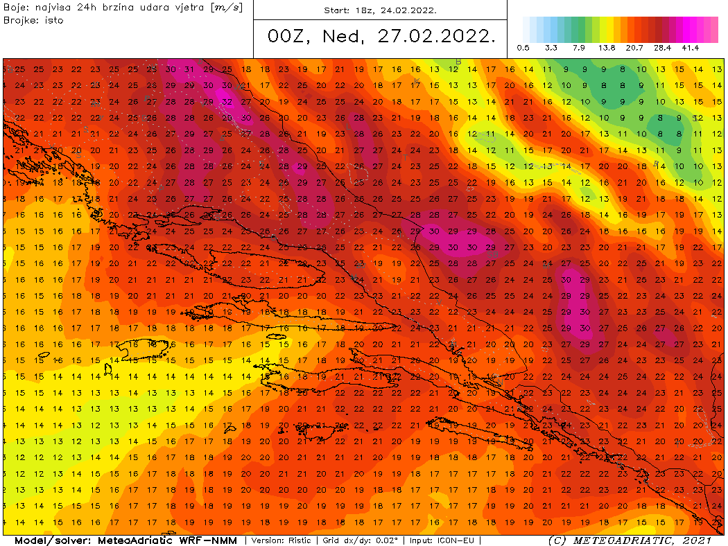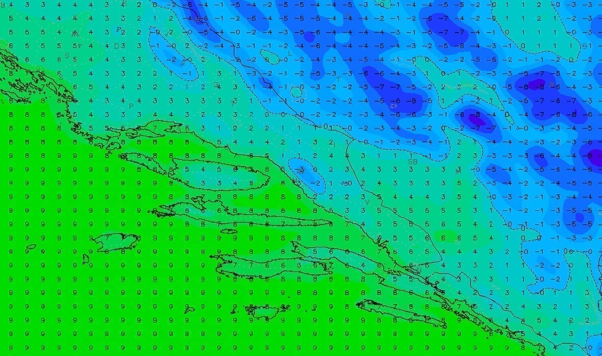 U subotu umjereno do znatno oblačno, osobito prijepodne uz povremenu kišu. Oborine će biti češće na moru nego u Zagori, a tamo može i zagrmiti. Kiša će u dijelu Zagore prijeći u snijeg, a malo snijega nošenog burom može biti uz obalu i na Braču. Oborine će prvo prestati na sjeveru Dalmacije, do večeri i u većem dijelu. Puhat će jaka do olujna bura, podno Velebita, Dinare i Biokova imat će orkanske udare. Bit će hladnije s najvišim dnevnim temperaturama od 4 do 11°C.