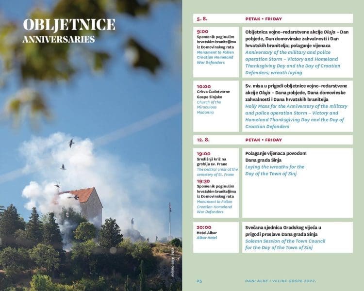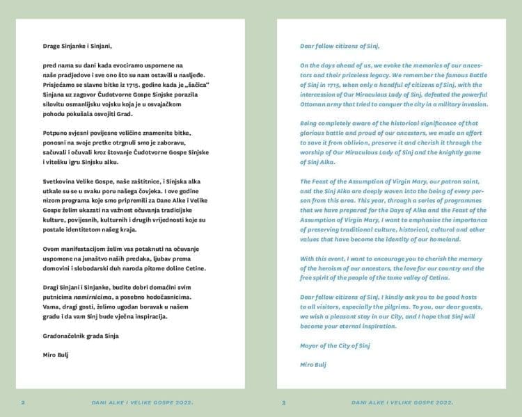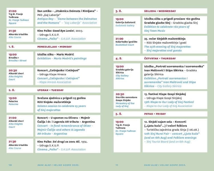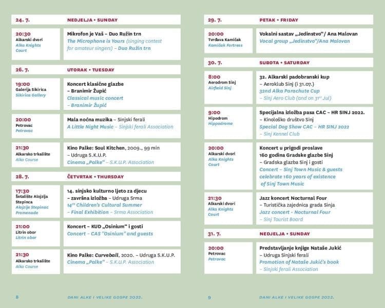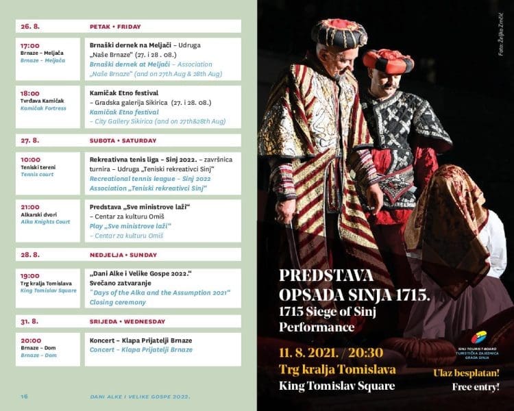Stigao je srpanj: već se u zraku sluti vreva i šušur živahnoga ljeta u Sinju. Krovna manifestacija Dani Alke i Velike Gospe i ove godine iznjedrila je mnoštvo događanja kojima će uvijek gostoljubivi Sinjani obradovati svoje goste.