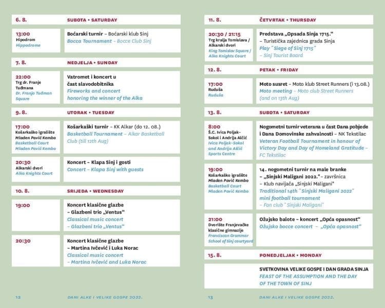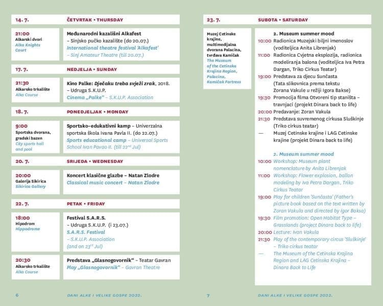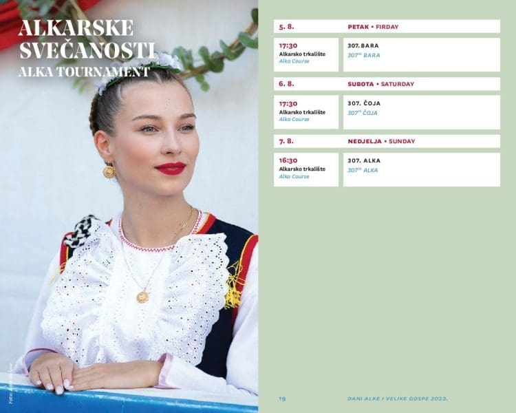 Uz neizostavne 307. alkarske svečanosti i proslavu blagdana Velike Gospe, domaći i furešti uživat će u koncertima, izložbama, sportskim i humanitarnim aktivnostima, kazališnim predstavama, predstavljanjima knjiga i raznim drugim priredbama. Cijeli grad pod Kamičkom postaje otvorena pozornica gdje će se pronaći ponešto za svačiji ukus.