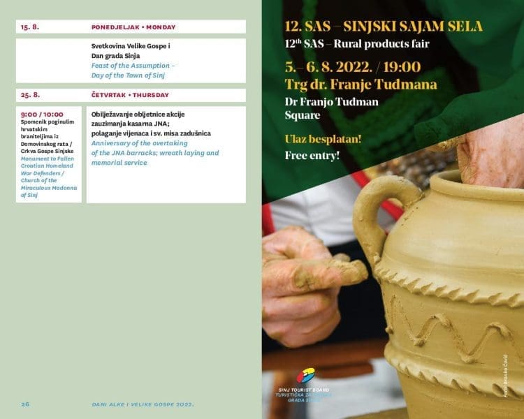Nikako ne propustiti sjajni Sinjski sajam sela i opskrbiti se izvornim tradicijskim proizvodima, a na večeri folklora podsjetiti se starih vremena i dobrih običaja te svakako uroniti u povijesno-scenski spektakl Opsada Sinja 1715., ove godine s još upečatljivijim zvučnim i svjetlosnim efektima", najavljuju iz Turističke zajednice Grada Sinja.
