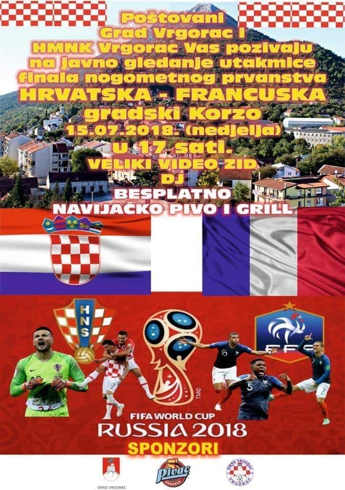 Sutra se sprema zajedničko gledanje utakmice uz besplatno navijačko pivo i roštilj. Na gradski Korzo bit će postavljen veliki video zid te će sve pratiti i prigodni glazbeni program.