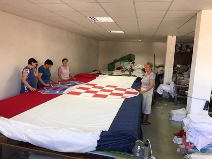 Zastava je duga 20 metara, široka pet, a sam grb je visok više od dva metra. Postavljena je u čast hrvatske nogometne reprezentacije i njenog sutrašnjeg nastupa u finalu Svjetskog nogometnog prvenstva.