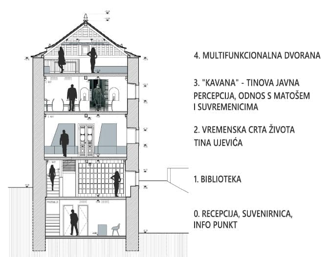 - U suterenu se uz prostor recepcije i suvenirnice koja se odnosi na lik i djelo Tina Ujevića planiraju se sanitarije za posjetitelje. Etaža prizemlja se predviđa kao prostorija za planiranu "biblioteku" gdje bi bila prikazana sveukupna arhiva autorskih dijela i prijevoda pjesnika Tina Ujevića – uglavnom digitalna, a dijelom i materijalna. Prvi kat se sadržajno oplemenjuje prikazom vremenske crte života Tina Ujevića, na interaktivan način, te uspoređujući događaje iz života pjesnika s njegovim svjetskim i domaćim suvremenicima. Drugi kat planira se izvesti kao „kavana“, gdje bi bio prikazan javni život Tina Ujevića, te njegov odnos sa suvremenicima putem interaktivnih projekcija. Potkrovlje se interijerski pretvara u multifunkcionalnu dvoranu u kojoj se mogu održavati razne radionice ili projekcije - otkriva plan gradonačelnik Pranić.
