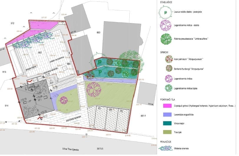 U vanjskom prostoru se planira zamjena podnih obloga, te prilagodba vanjskog stepeništa koje je cijelom površinom neposredno oslonjeno na tlo.