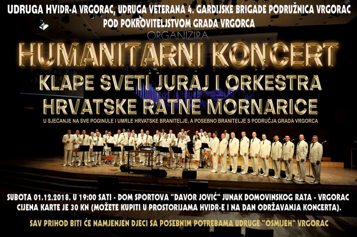 Udruge HVIDR-a Vrgorac i veterani 4. gardijske brigade podružnica Vrgorac, pod pokroviteljstvom Grada Vrgorca, organiziraju Humanitarni koncert klape Sveti Juraj i orkestra Hrvatske ratne mornarice.