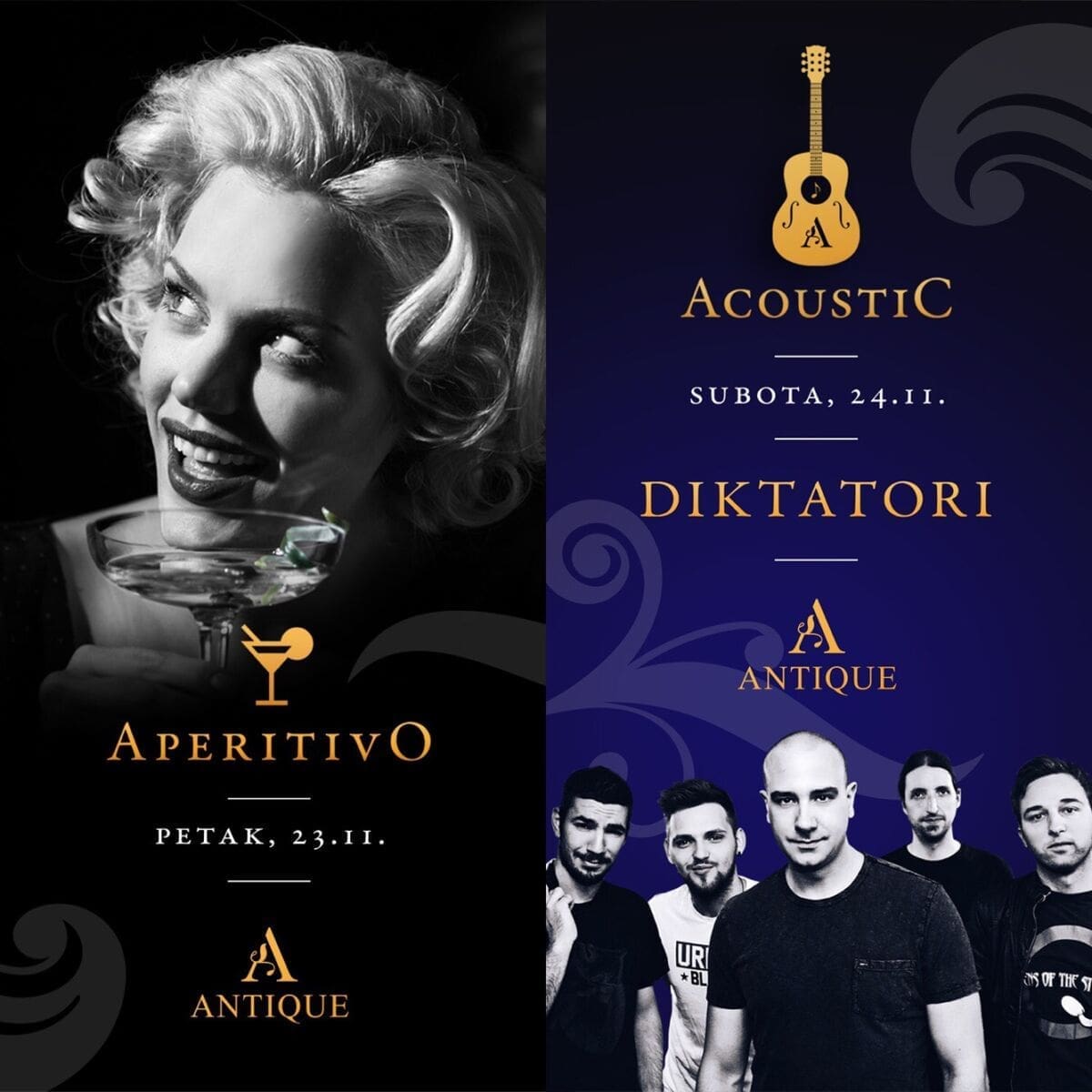 “Aperitivo" & "Antique acoustic" postali su vrhunska splitska priča za kojom iz vikenda u vikend vlada ogroman interes. Večeras u Antique baru uživajte u ručno rezanom pršutu, sirevima, kvalitetnim vinima i sjajnoj glazbi, a sutra se prepustite akustičnim obradama brojnih hitova u izvedbi DIKTATORA.