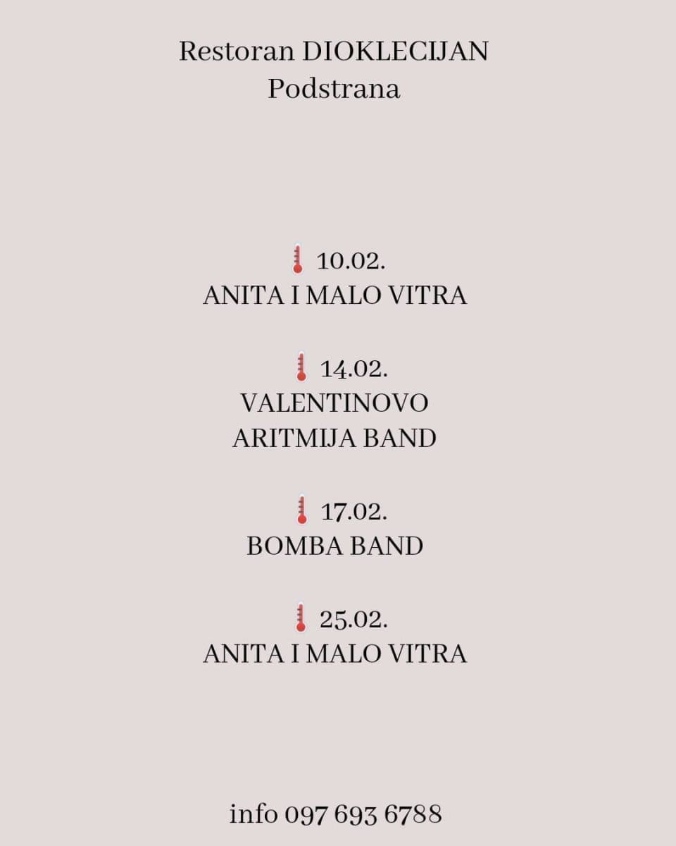 U petak se za dobru atmosferu brinu Anita i Malo Vitra, a za Valentinovo svira band Aritmija. Svoje mjesto možete rezervirati na 0976936788.