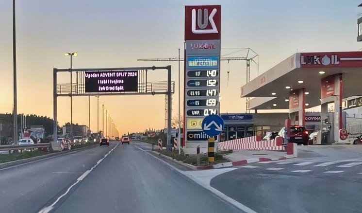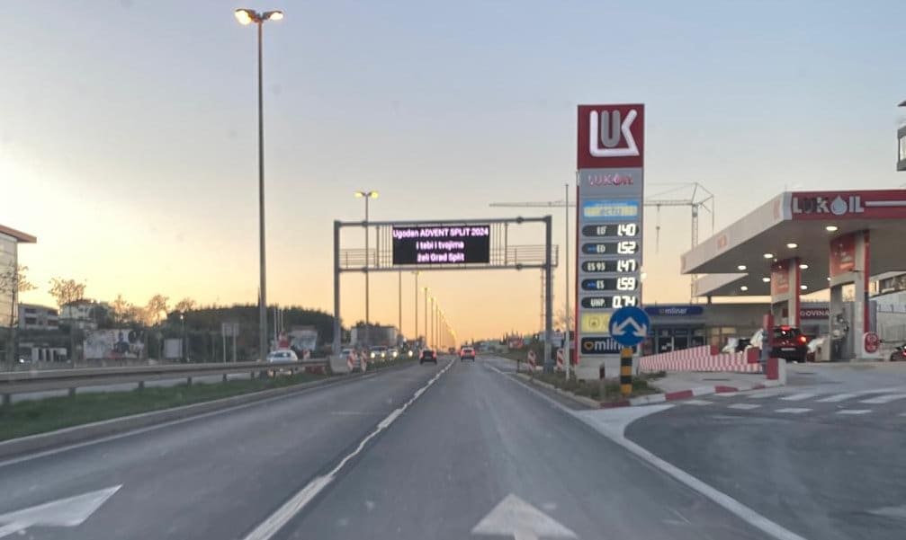 "Ugodan ADVENT SPLIT 2024. i tebi i tvojim želi Grad Split", piše na prvoj, svečanoj poruci na displeju zbog kojeg su vozači oko mjesec dana bili prisiljeni trpjeti dodatne gužve na inače prometom zagušenom dijelu grada.