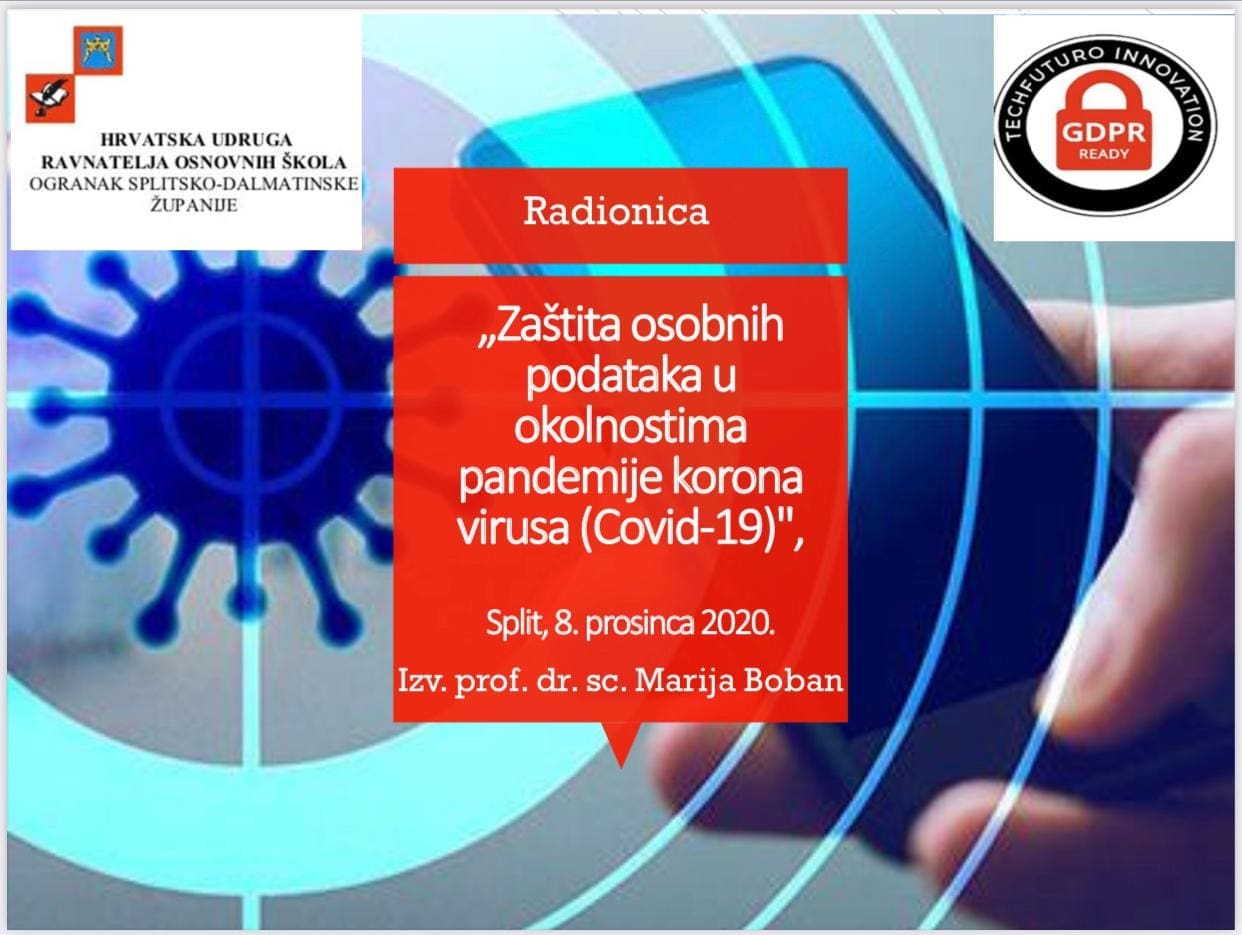 Radionicu je otvorio Đuro Baloević, prof. predsjednik HUROŠ-a SDŽ. Radionica je započela predavanjem na temu: „Zaštita osobnih podataka u okolnostima pandemije korona virusa (Covid-19) – izazovi i primjena u praksi“, koje je održala izv. prof. dr. sc. Marija Boban, izvanredna profesorica Pravnog fakulteta u Splitu i direktorica Techfuturo innovation j.d.o.o.