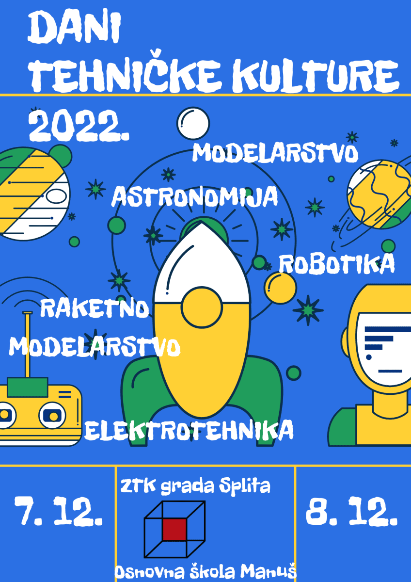U dane 7. i 8. prosinca 2022., u osnovnoj školi „Manuš“, održat će se još jedna od brojnih manifestacija koje Zajednica tehničke kulture grada Splita organizira i provodi u suradnji s udrugama članicama i osnovnim školama u Splitu i okolici. Navedena manifestacija provest će se u sklopu održavanja ovogodišnjih Dana tehničke kulture 2022., a u sklopu nje, svi zainteresirani učenici OŠ „Manuš“ imat će priliku prisustvovati raznim radionicama tehničkih aktivnosti.
