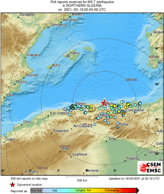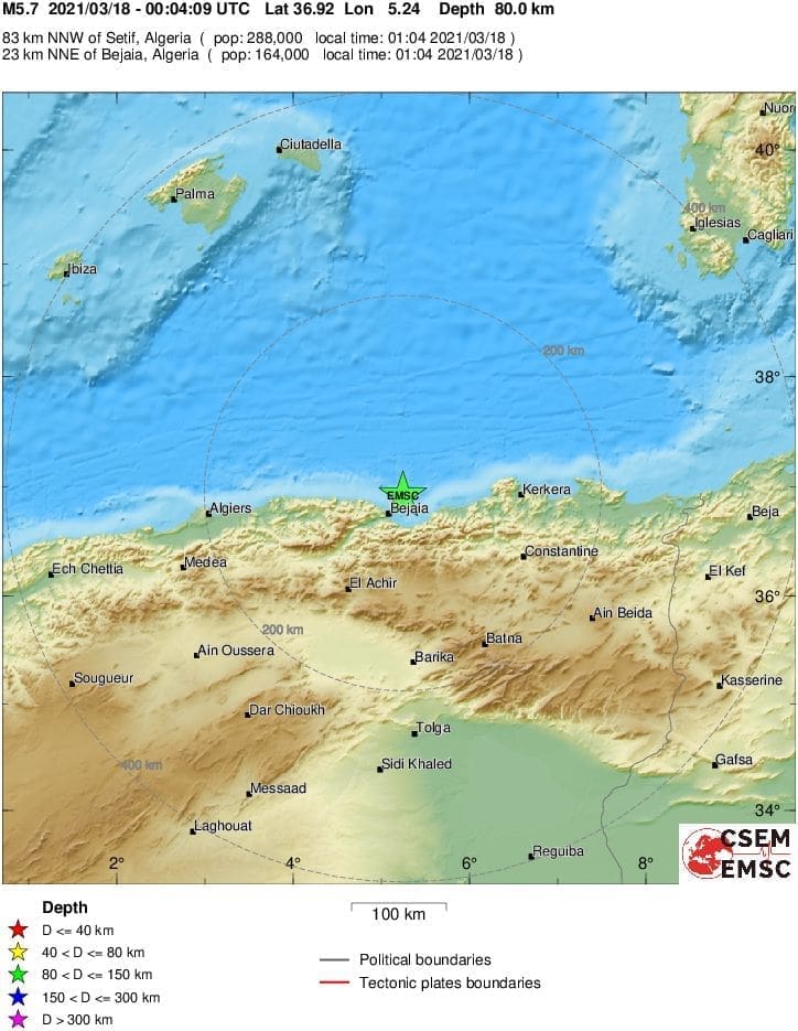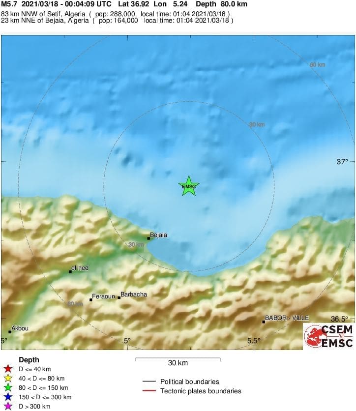 Prema podacima EMSC-a, magnituda potresa iznosila je 6.0 prema Richteru, a epicentar je bio 24 kilometra od obalnog grada Bejaïa.