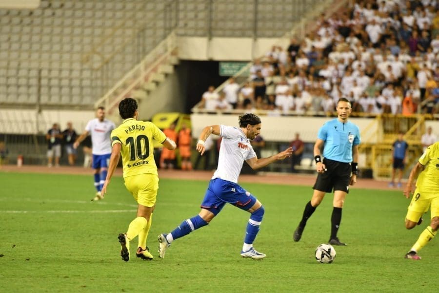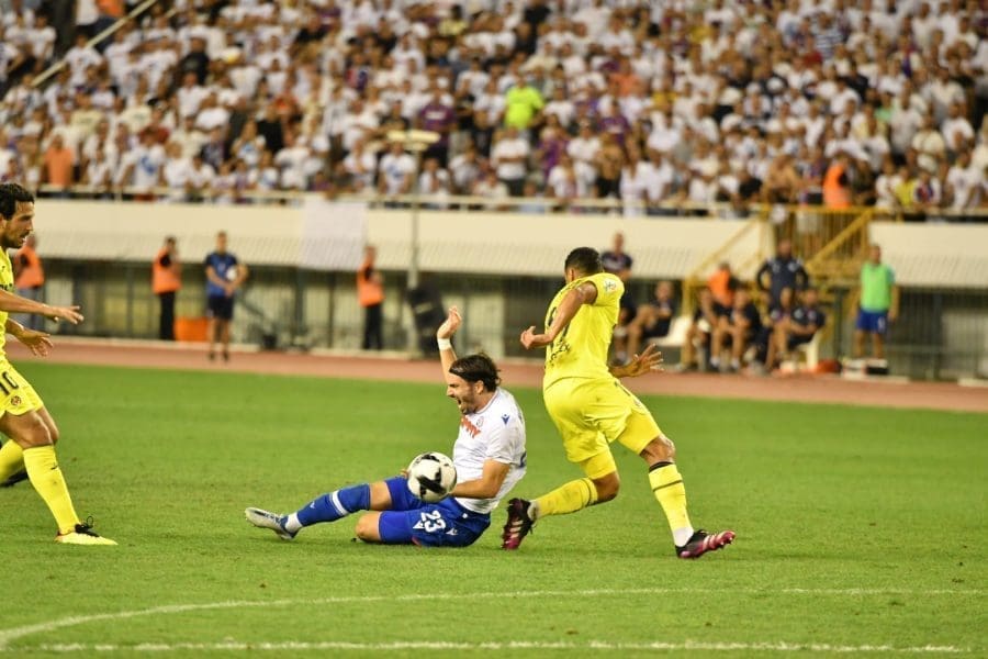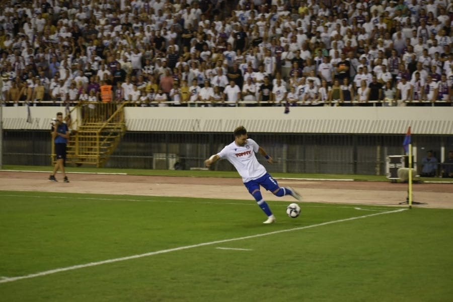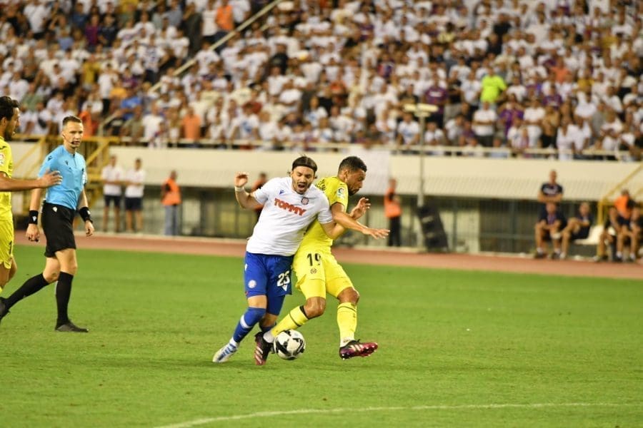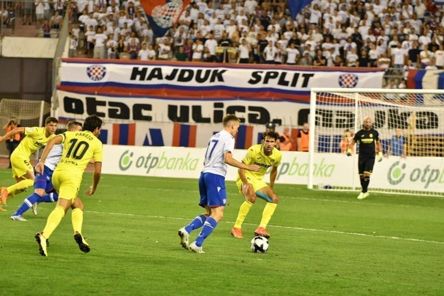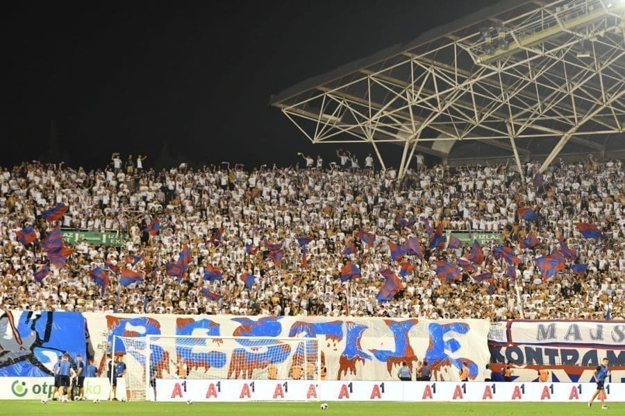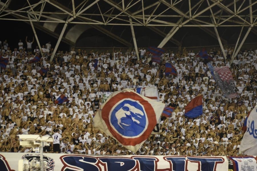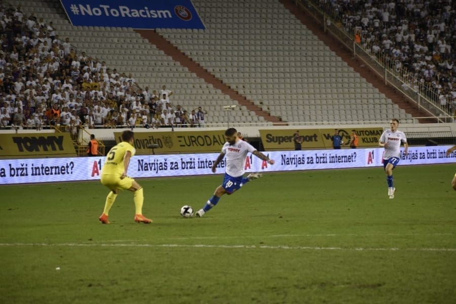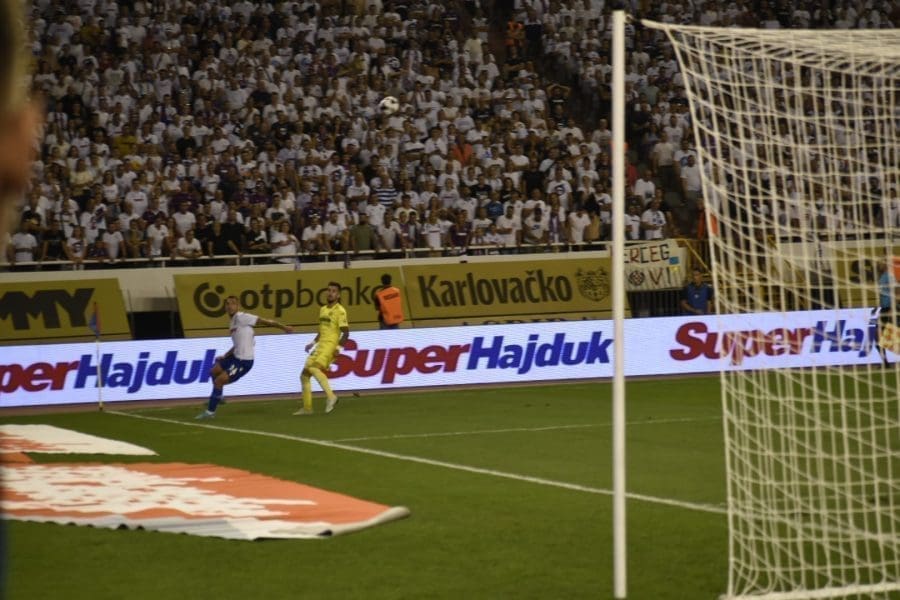 Hajduk na Poljudu igra uzvratnu play off utakmicu kvalifikacija za europsku Konferencijsku ligu. Na prepunom Poljudu je sjajna atmosfera i igra se vrlo čvrsta utakmica na terenu.