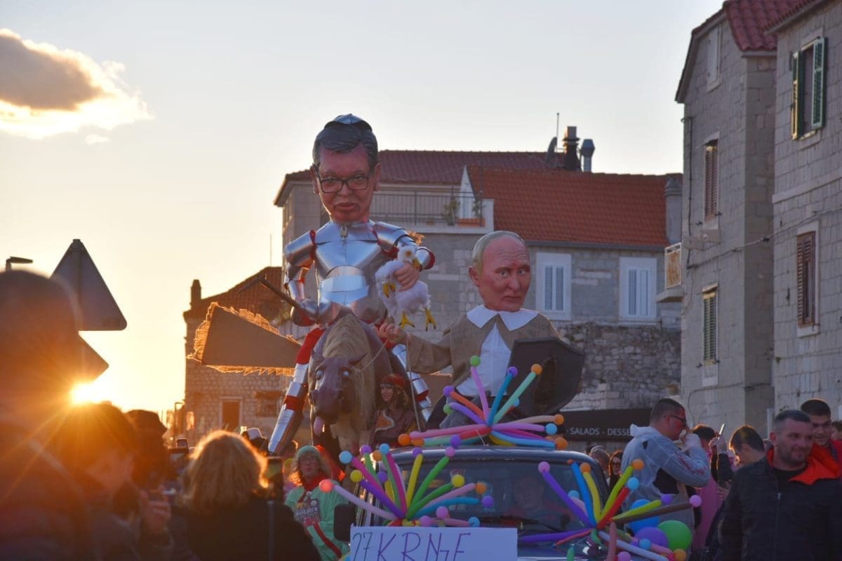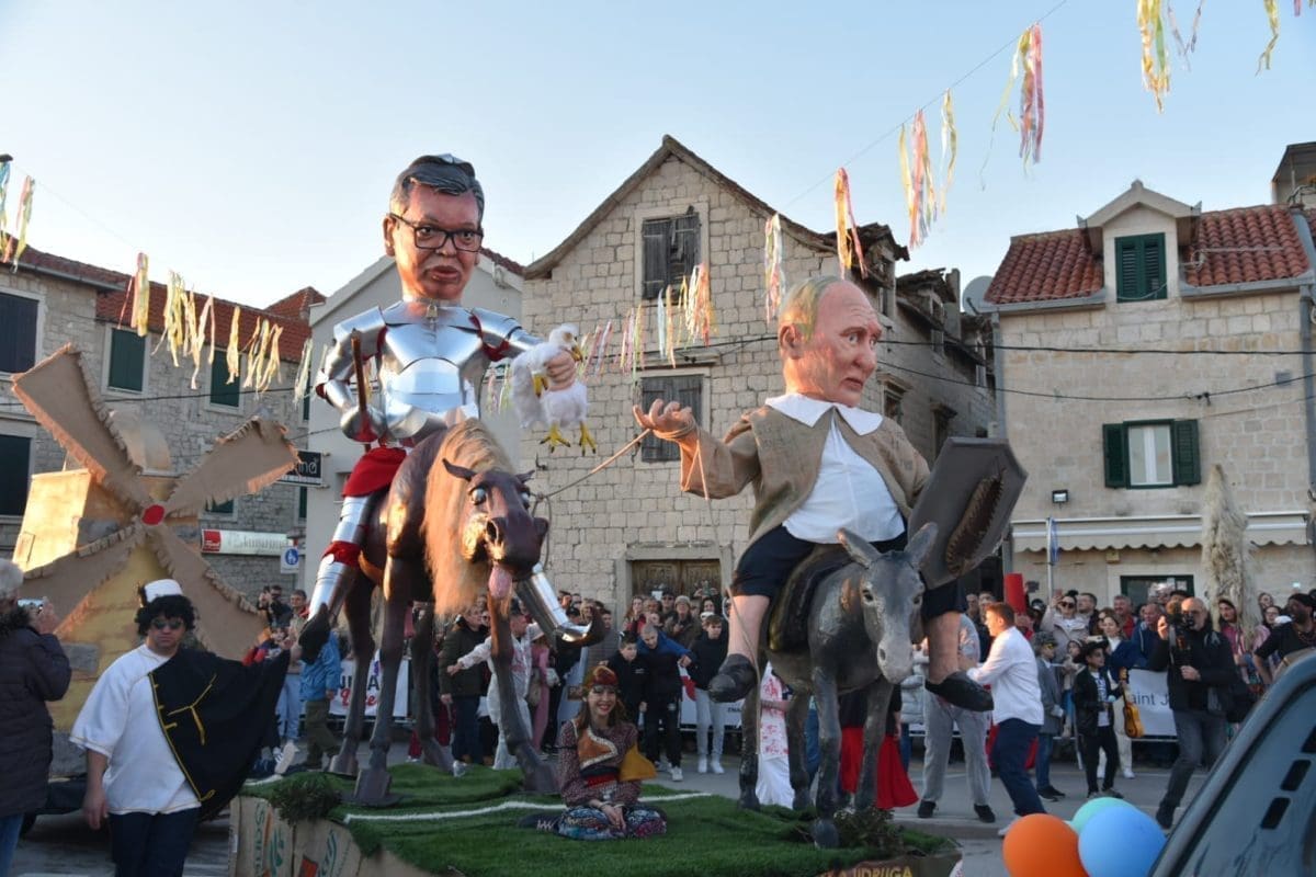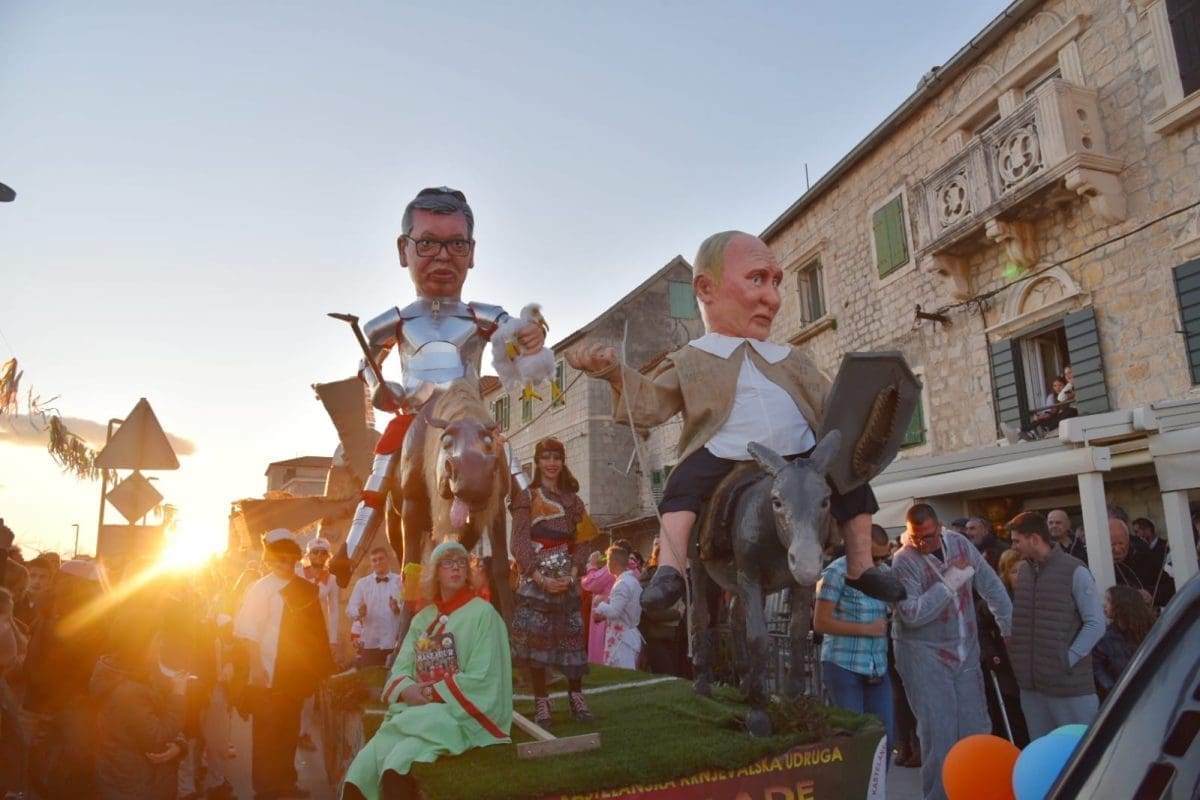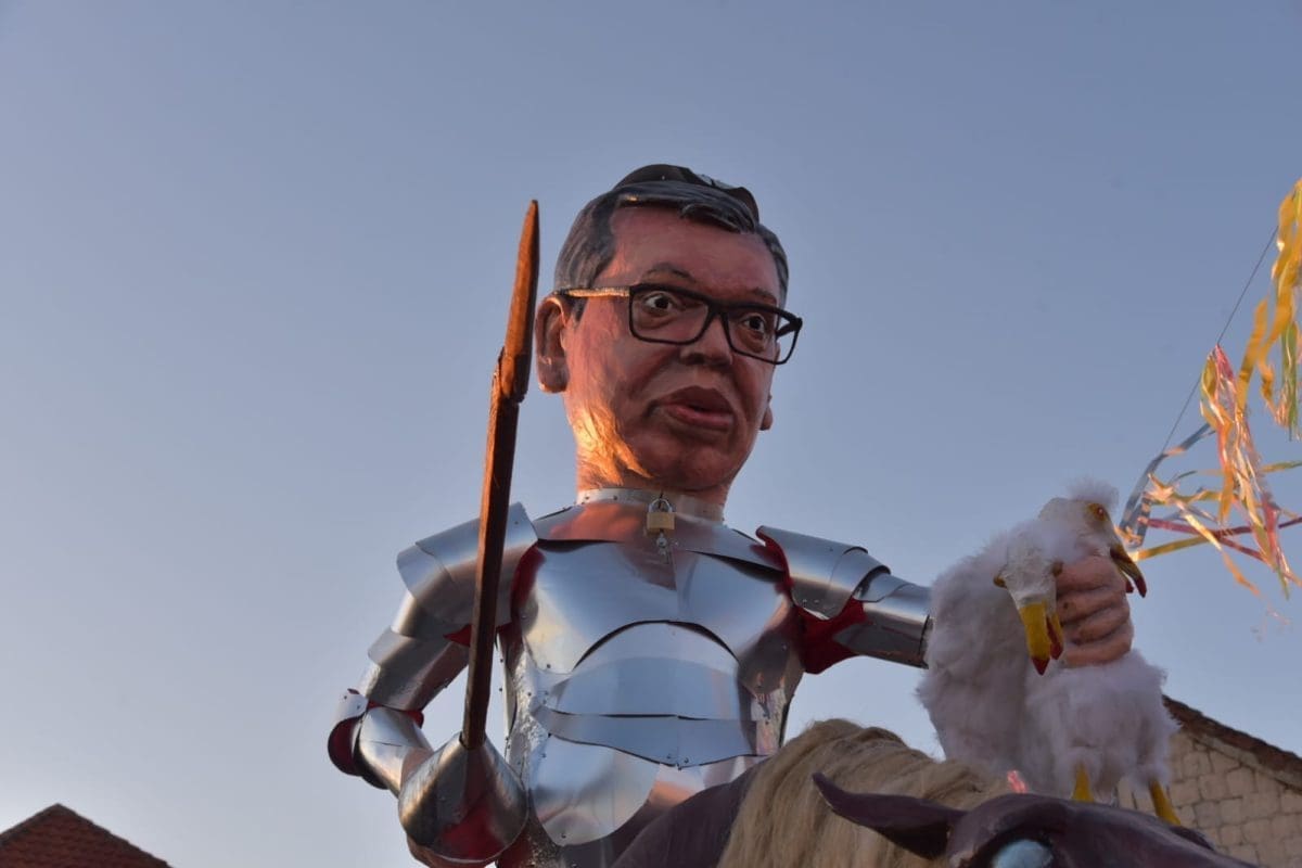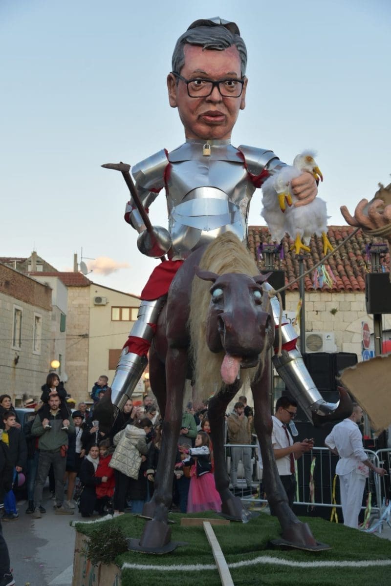 Krnju su predstavljali srbijanski predsjednik Aleksandar Vučić i ruski Vladimir Putin, koji su bili prikazani poput Don Quijota i Sancha Panze na magarcima te su njihove lutke na kraju završile u plamenu.