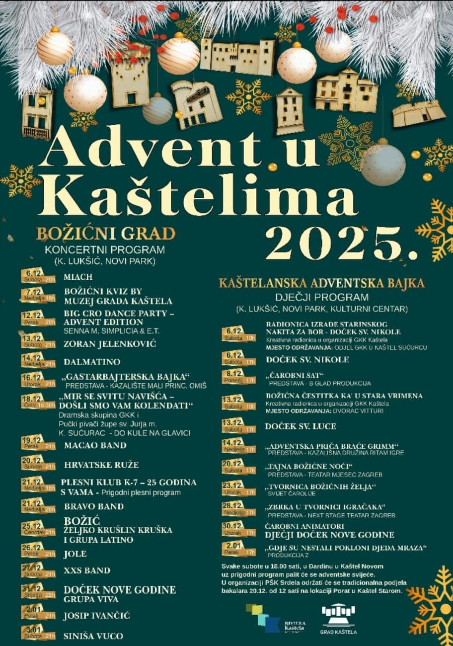 Grad sporta i grad ljubavi i ove godine organizira adventska događanja, koja su sudeći o imenima izvođača jedna od najboljih do sada. Grad Kaštela i Turistička zajednica grada Kaštela uz podršku lokalnih udruga i ustanova, tijekom prosinca organizira "Božićni grad 2025."
