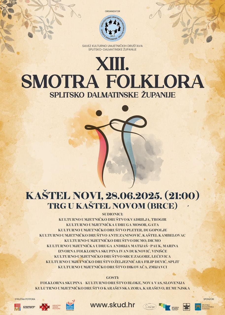 Ove godine će se smotra, uz domaćinstvo Grada Kaštela, Turističke zajednice Grada Kaštela, te udruge „Šušur“ iz Kaštela, održati u subotu, 28. lipnja 2025. na ljetnoj pozornici (Brcu) u Kaštel Novom s početkom u 21:00, u okviru višednevne 16. kulturne manifestacije „Nostalgija“ (Dana tradicije s eko-etno sajmom i sajmom hrvatskih otočkih proizvoda). Smotra će okupiti folklorne amatere koji se u svojim matičnim zajednicama, općinama i gradovima, bave aktivnostima kulturno-umjetničkog amaterizma povezanog s revitalizacijom i očuvanjem folklorne baštine te kulturnog identiteta svojih zajednica, ali i naše županije, te Hrvatske u cijelosti. Ove godine će se na XIII. smotri predstaviti sveukupno 10 kulturno-umjetničkih udruga naše županije.