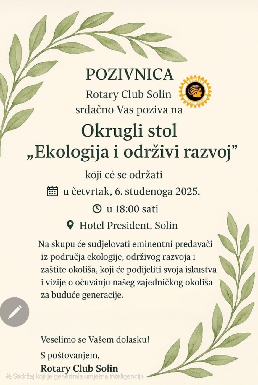 Rotary klub Solin domaćin je okruglog stola na temu Ekologije i održivog razvoja, koji će se održati u četvrtak, 6.studenog u 18 sati u solinskom hotelu President uz sudjelovanje eminentnih predavača iz područja ekologije, održivog razvoja i zaštite okoliša.