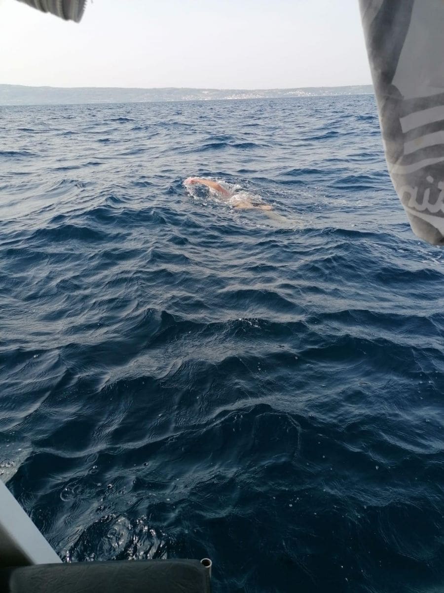 Jutros u 5 sati krenuli Splićanin Goran Jurišić Goga 80% invalid Domovinskog rata i mlada plivačica Antonia Buličić u pothvat preplivavanja dionice od Split do Supetra.