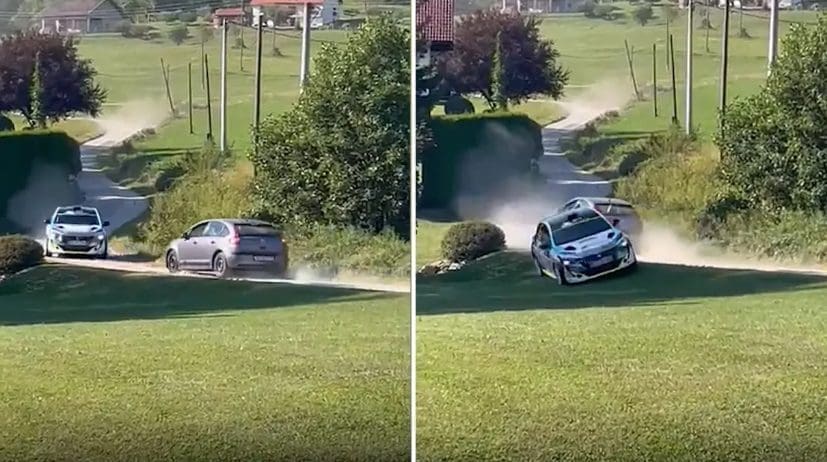 Zabilježen je i trenutak u kojem je zamalo došlo do frontalnog sudara automobila i natjecatelja. Organizatori su nam ustupili dramatičnu snimku na kojoj se vidi kako vozač rallyja u zadnjem trenutku skreće na obližnju livadu čime je izbjegnut sudar s civilnim autom koji se tamo nije trebao naći.