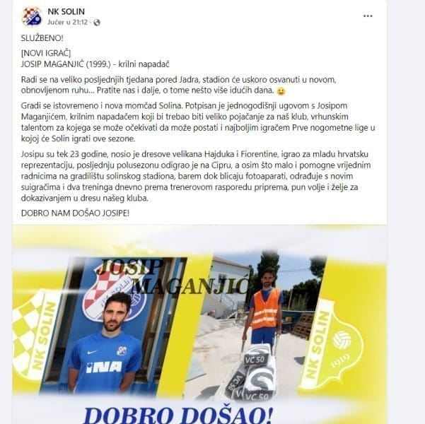 Josip Maganjić, 23-godišnji krilni napadač, novi je igrač drugoligaša Solina, objavio je klub sa stadiona pokraj Jadra na svojim službenim stranicama.